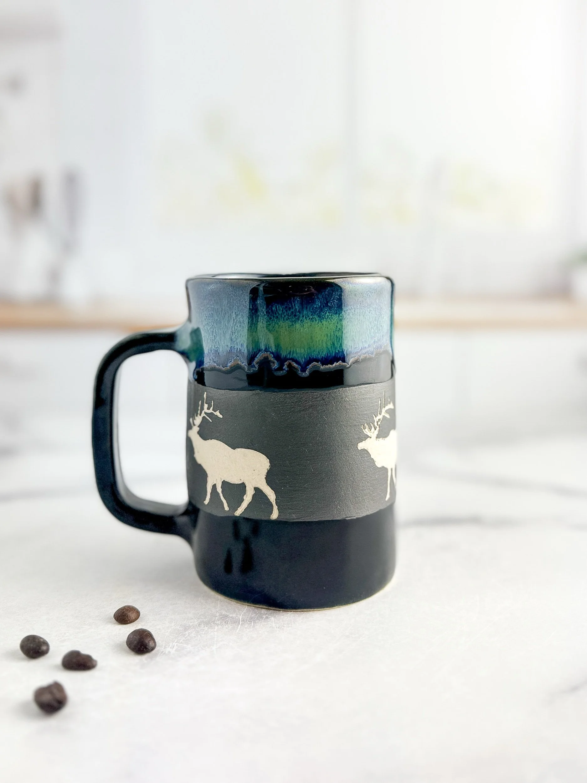 Hand Carved Elk mug in Northern Lights