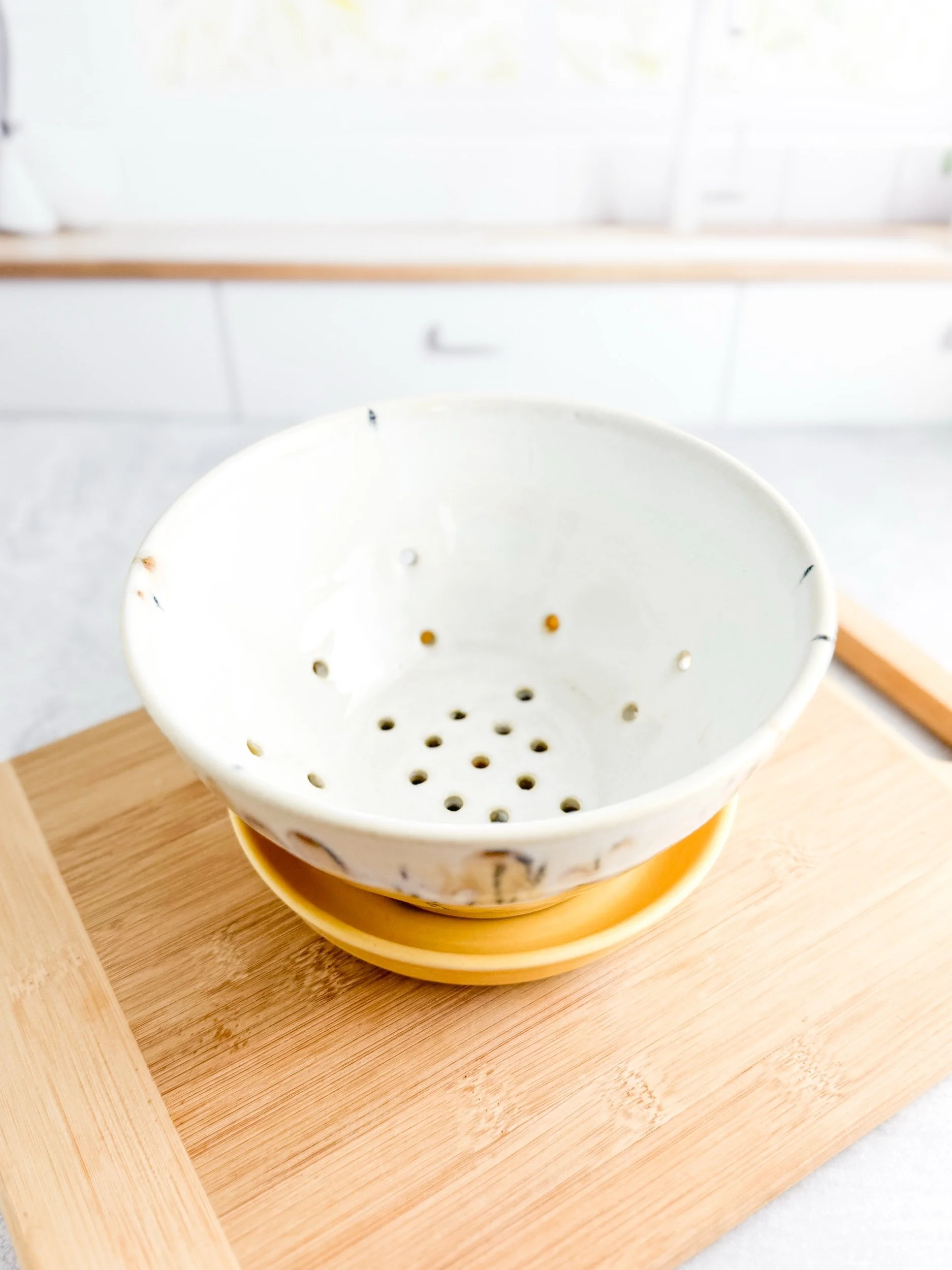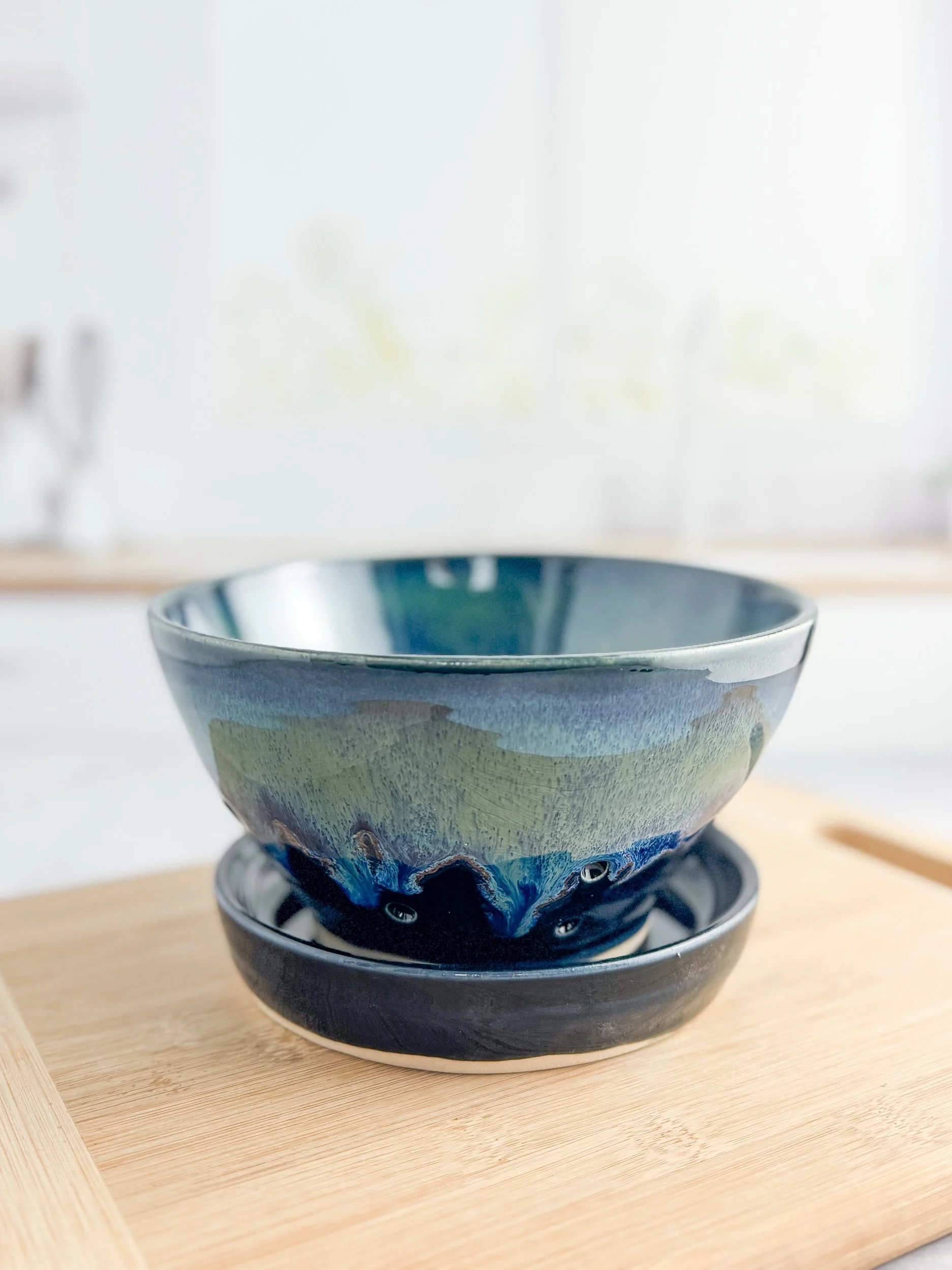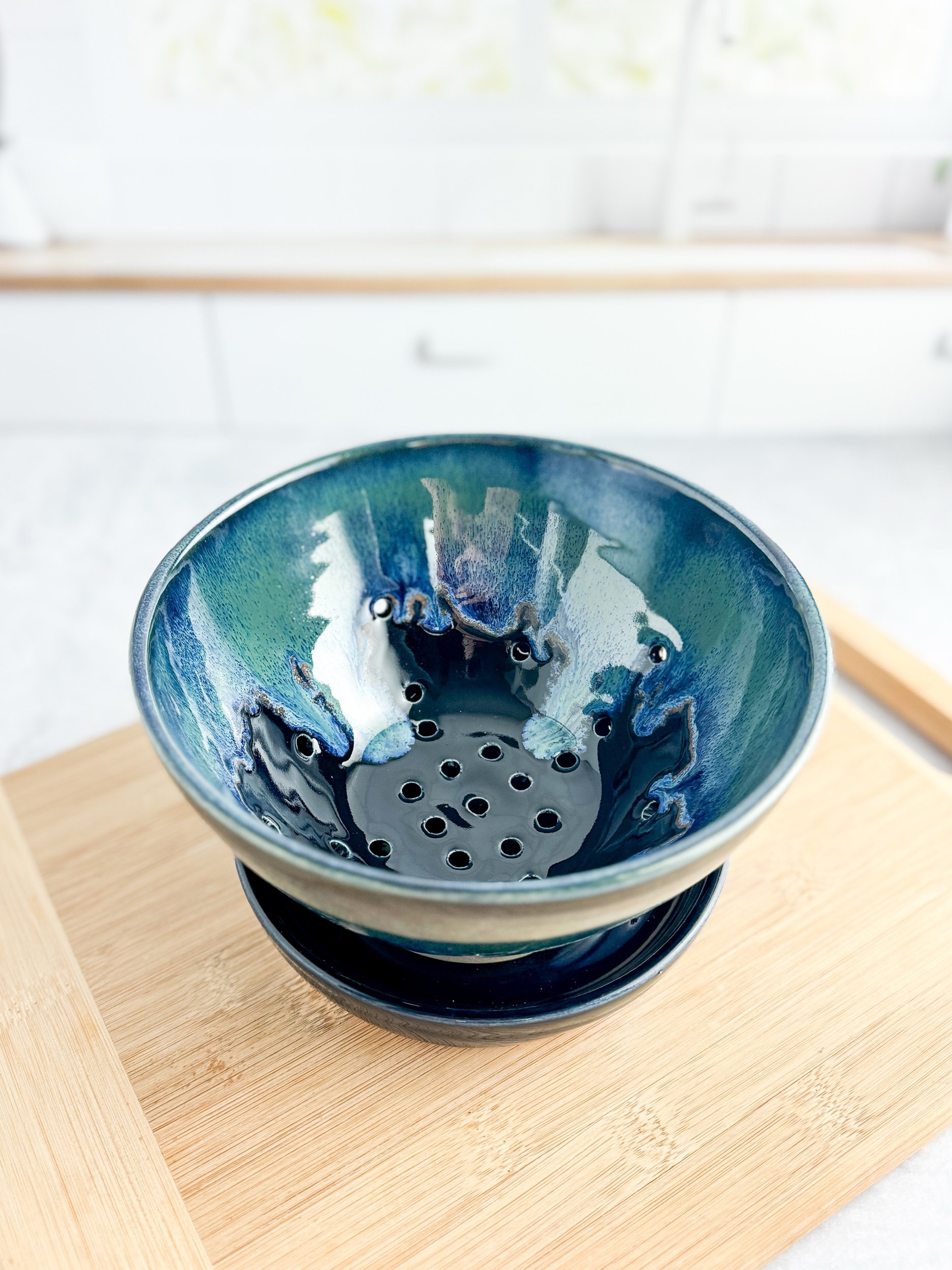 This bowl is perfect for washing your berries before serving. It is wheel thrown before adding each individual drain hole! These make an amazing addition to any gathering.