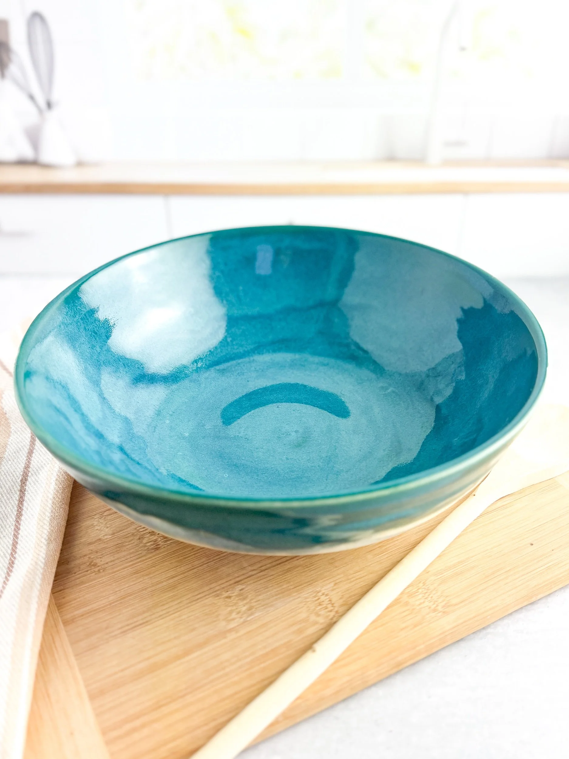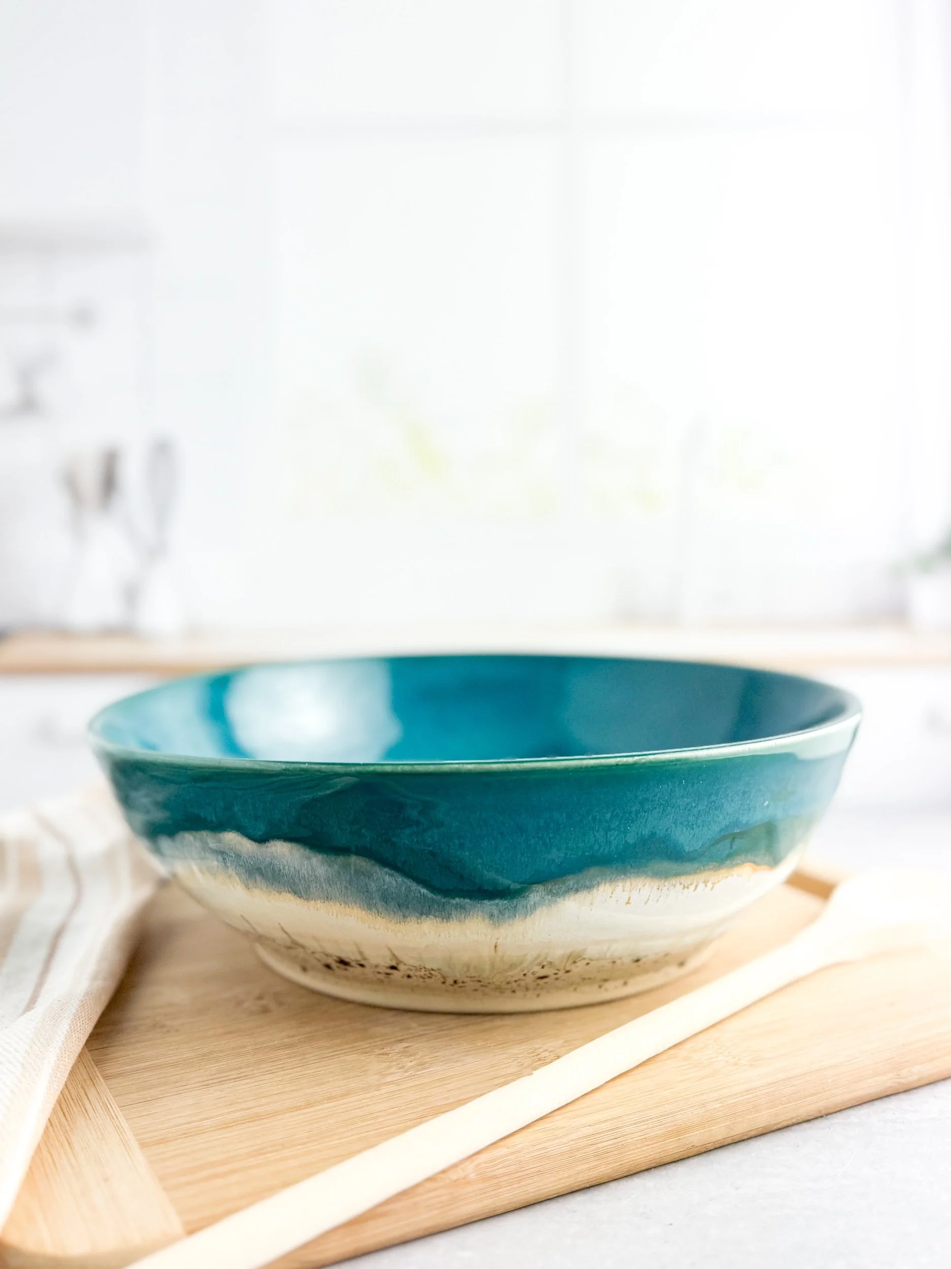 This beautiful large serving bowl, is made on the potter’s wheel and glazed with beautiful food safe glaze.
